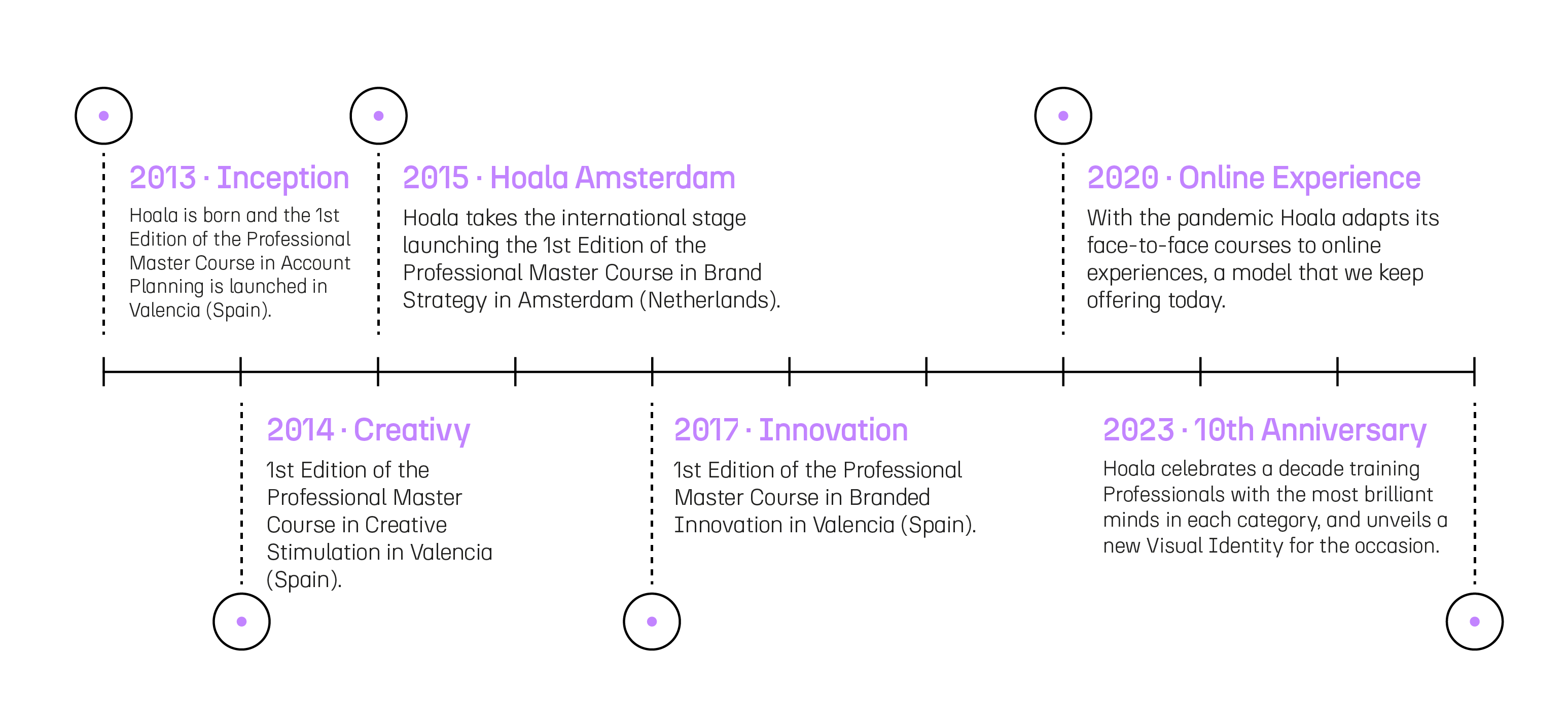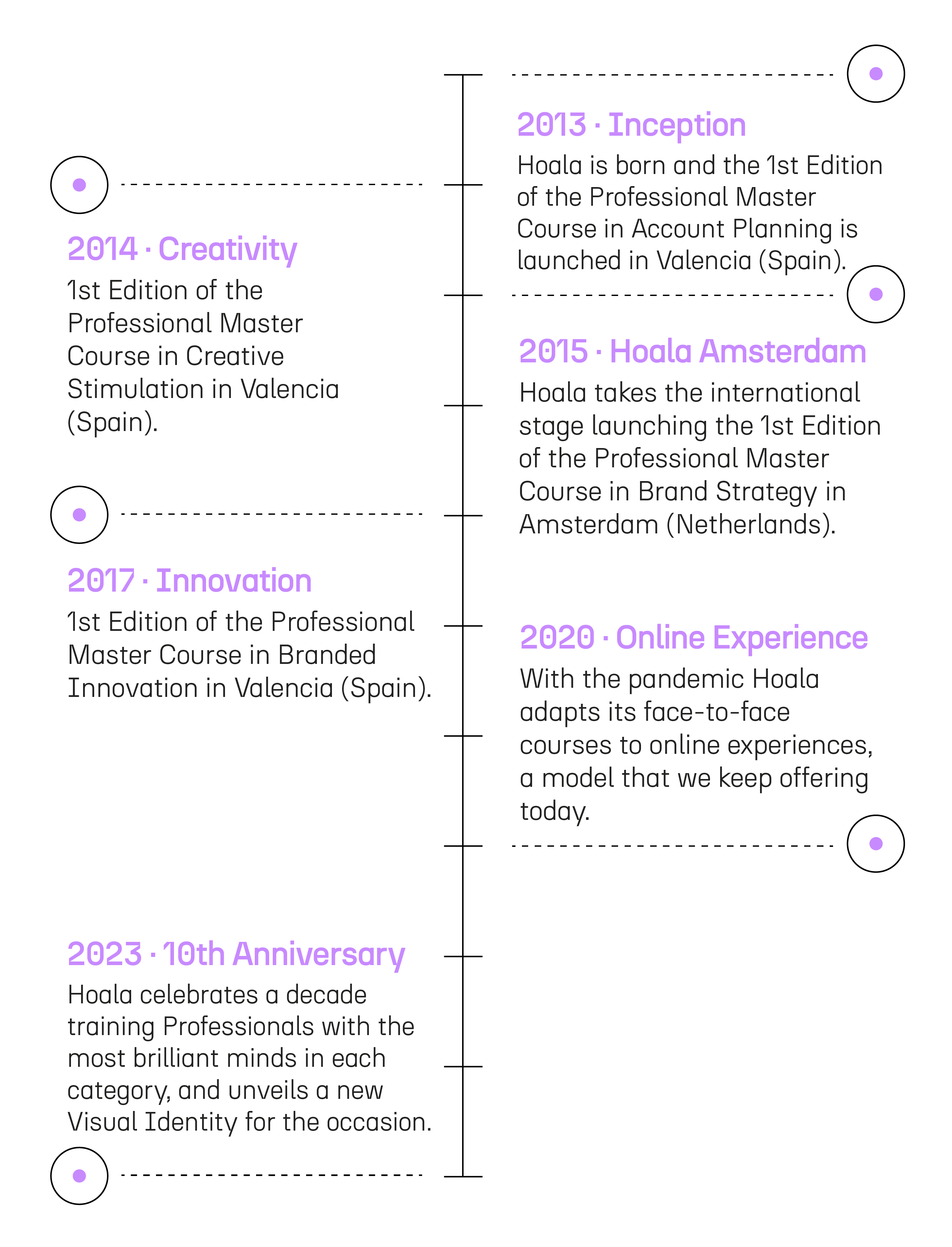 When Hoala was born in 2013, it did so with a clear purpose and mission: to offer the best international training in strategy, innovation and creativity fields. Of course, with a big difference with respect to everything that existed on the market: a training aimed solely and exclusively at brand communication professionals. Because behind a great professional there’s always a curious person who wants to continue learning.